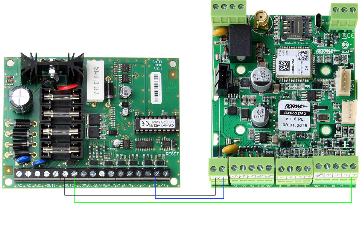 Pagrindinės plokštės "SATEL CA-4V1" sujungimas su "Ropam Basic" GSM pranešimų moduliu