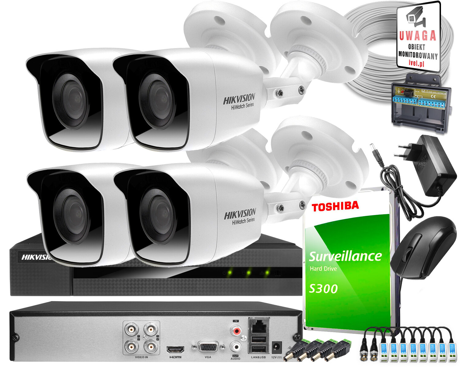 Vaizdo stebėjimas per sukamąją Hikvision Hiwatch Turbo HD, AHD, CVI įrašytuvas su 4 kanalais, 4 x HWT-B140-M, 1TB, Priedai