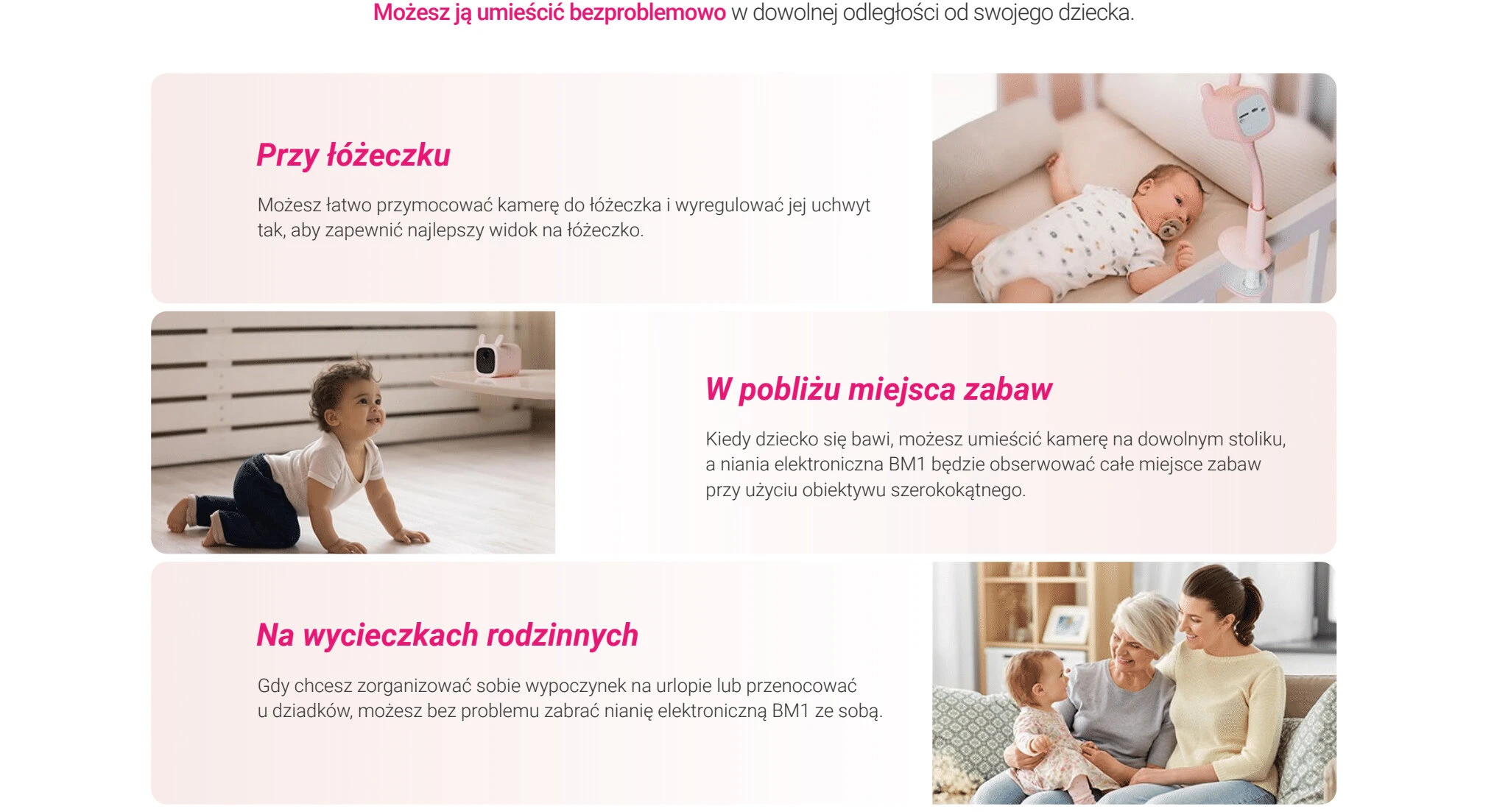 BM1 elektroninė auklė padeda tais atvejais, kai negalite greitai nueiti pas savo mažylį. Aptikusi verksmą, auklė gali automatiškai pradėti groti lopšinę, kad šiek tiek nuramintų kūdikį. Be to, tėvai gali kalbėtis su savo mažyliu per kamerą, tarsi būtų šalia jo.
