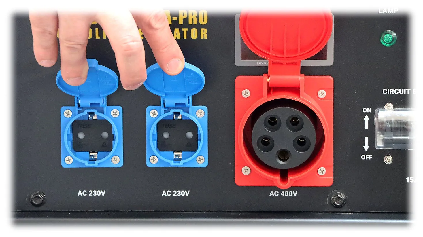 - Napięcia i gniazda: 230/400 V AC; 1× 3-fazowe 32 A (IEC 60309) + 2× jednofazowe 16 A (Schuko)