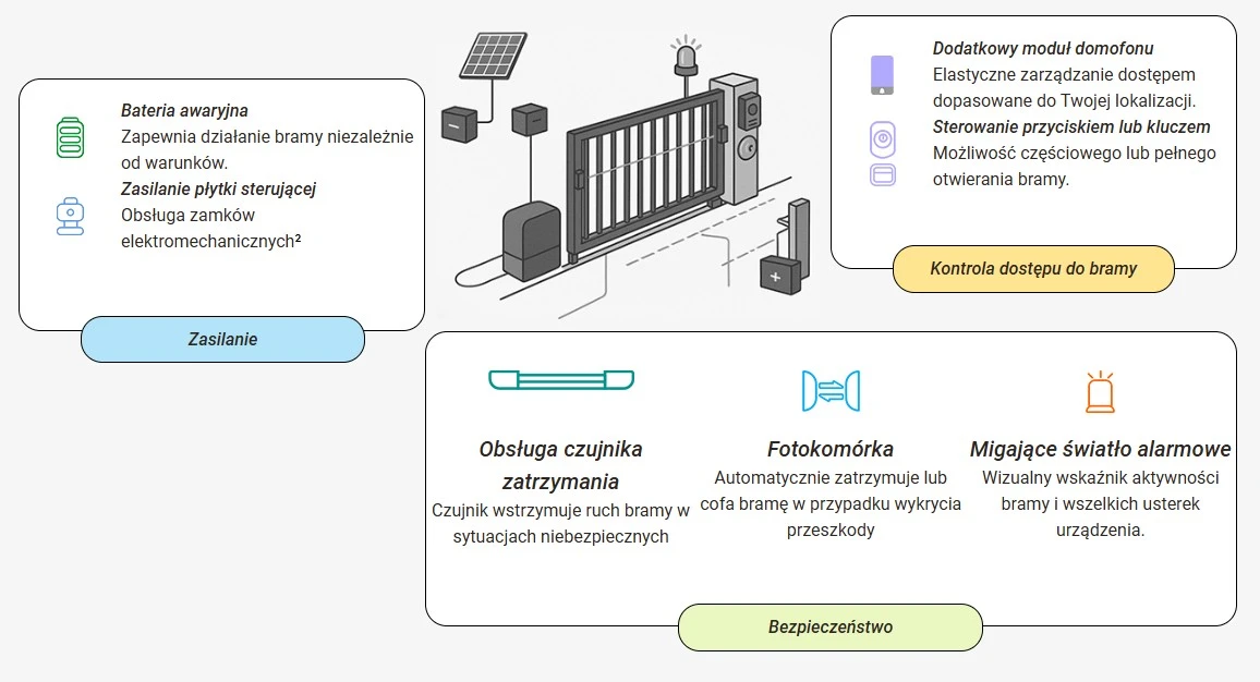 - Akcesoria: Kompletny zestaw akcesoriów, w tym lampa alarmowa, fotokomórki, listwy zębate, piloty, oraz instrukcja obsługi.
